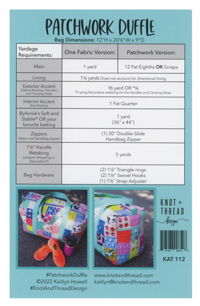 This darling duffle bag can be made in two ways, using one fabric or doing patchwork for the outer section. Either way they turn out so cute. Pattern is from Knot & Thread, it's available as a paper pattern or a digital download. I've attached fabric requirements for both bags.